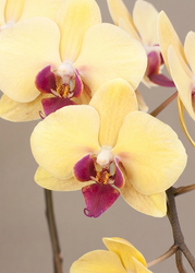 中輪淡黃蝴蝶蘭「ゴールデンサプライ」三本立,意味「源源的金運」。這款罕見的中輪蝴蝶蘭以奶黃色為主調,中央的唇瓣為紅絲絨調,予人高貴、華麗的氣質。由愛知縣的花農親手為每朵花輪排列、矯型,再以至高規格的包裝方式,原箱安全空運抵港。